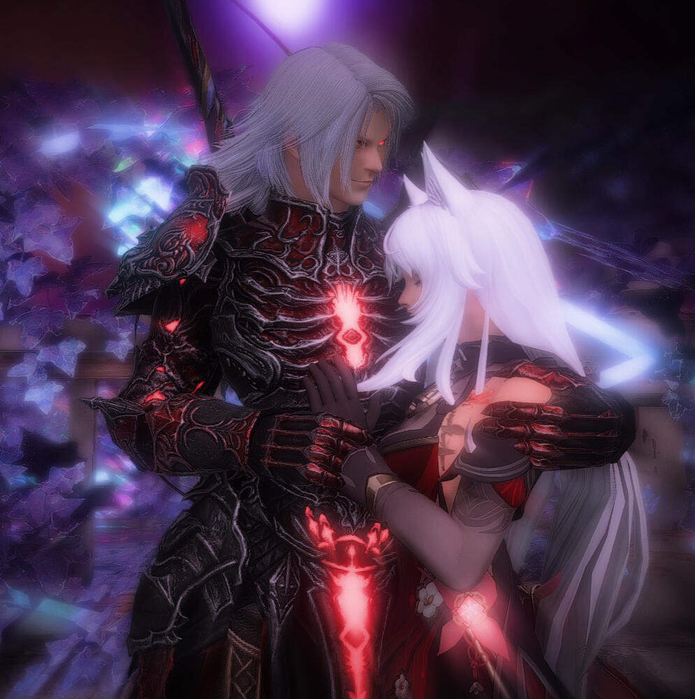 He has loved before. His former partner, Estelle Delacroix, bore him a daughter: Marcelline, a voidsent in Miqo’te form. Estelle, a Reaper and Dark Knight, was corrupted by her void jester avatar after it fed her its own aether to mend her soul.When Cinder Hawke staged her coup, Red sent Estelle and their daughter to Sharlayan for safety. Cinder and other traitors would go on to form their own company: Anyroad.Though the weight of betrayal still lingers, Red is no longer alone.His beloved, Adel Ushiromiya, now known as Neia Natsume, a skilled Gunbreaker and Red Mage, accepted him fully after years apart. They now lead the Hunters side by side.Red trains his troops in Nyaalascape, a virtual datascape built from Nalako’s designs. He meditates daily, hunts alone, and guards the people from the shadows. He will never let the Hunters fall.He is their protector, their sword, and their shield.He is Red.